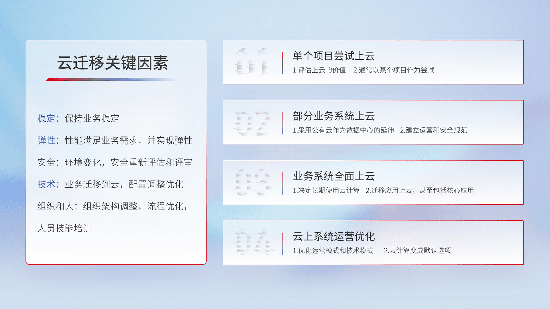 结合实际业务,,,从规划设计、、、、云平台选型、、云原生改造、、、数据迁移、、、、集成交付,,,,迁移全过程为客户识别最佳上云路径,,做好风险识别管理,,,设计网络架构、、、、身份权限、、、安全审计合规、、操作审计、、日志审计、、、监控告警策略、、、、多站点容灾设计等,,对云上基础设施进行整体规划,,,提升IT治理水平,,以满足弹性、、、、高可用、、高性能的需求。。